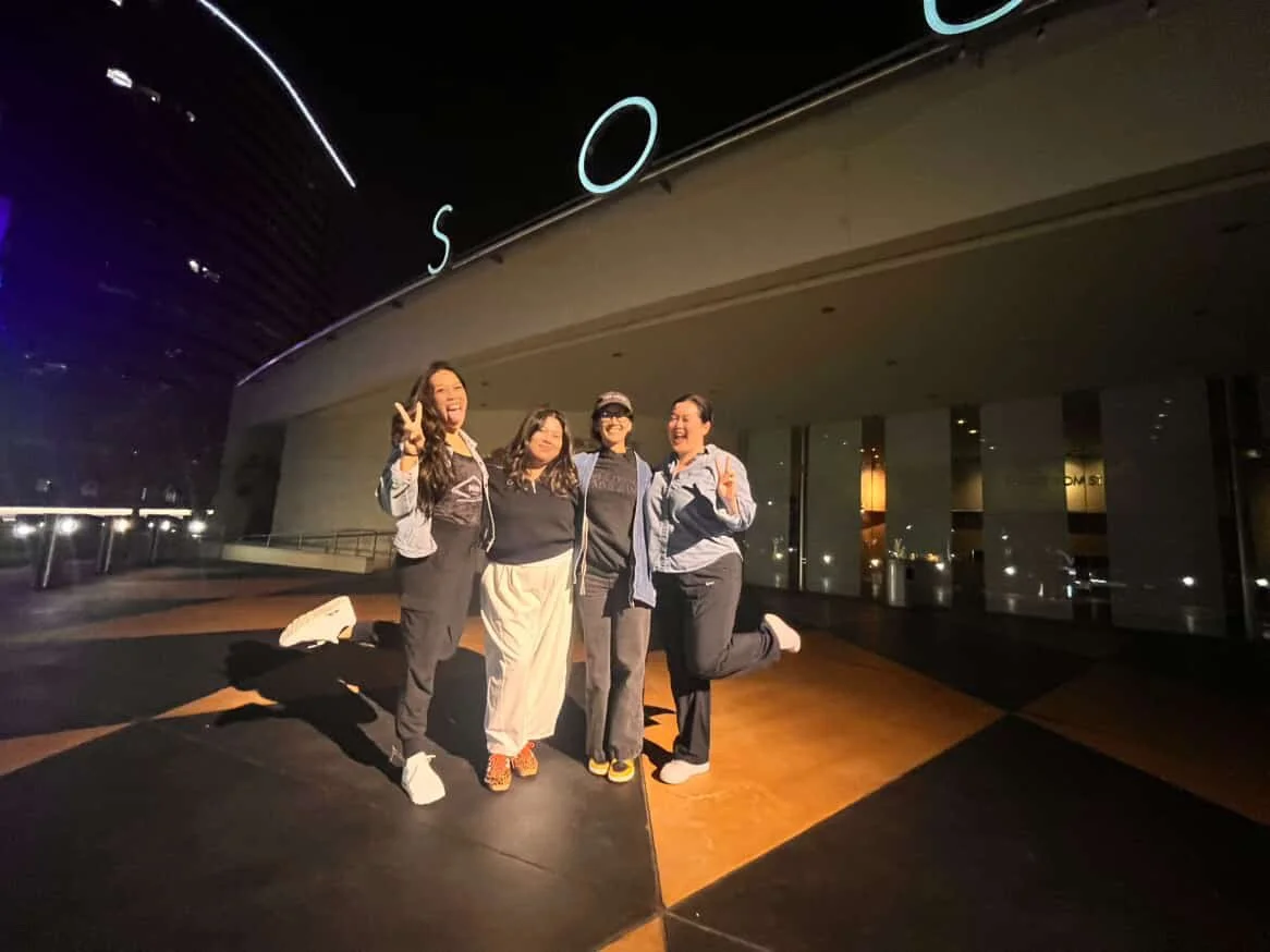 Nicole Javier, Joy Lanceta Coronel, Jennifer Chang, and Narea Kang in front of South Rep Theatre in Costa Mesa, California.